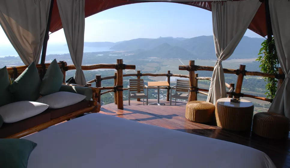 亚龙湾人间天堂鸟巢度假村地处热带滨海山地,近热带天堂森林公园。该度假村分东西两园,依山傍海,园区内所有的鸟巢型客房都建于丛林之上且以各类飞禽的名字命名。住在客房里,就像化身为飞鸟,打开门窗就能赏云观鸟,鸟瞰海湾美景,野趣十足。