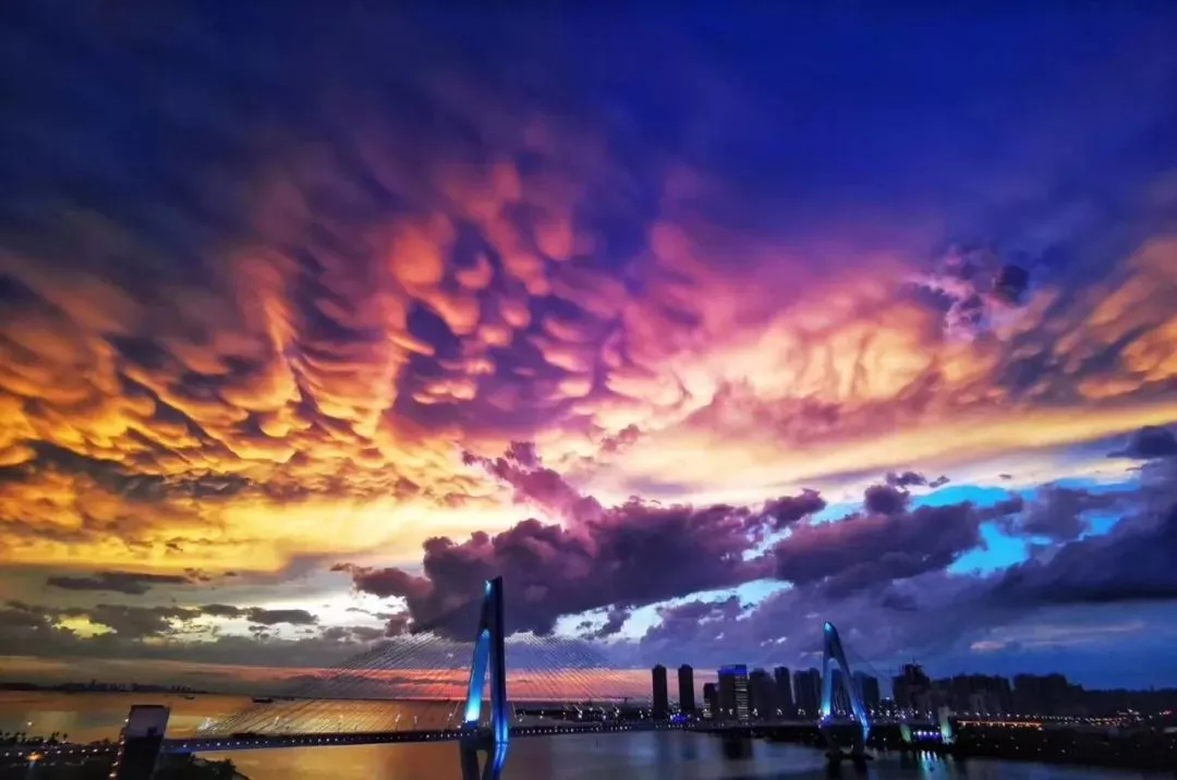 在海口,出现一种“七彩祥云”,如梦似幻。一缕缕轻薄的云层透出绚烂的色彩,红橙黄绿青蓝紫七色变幻无穷。