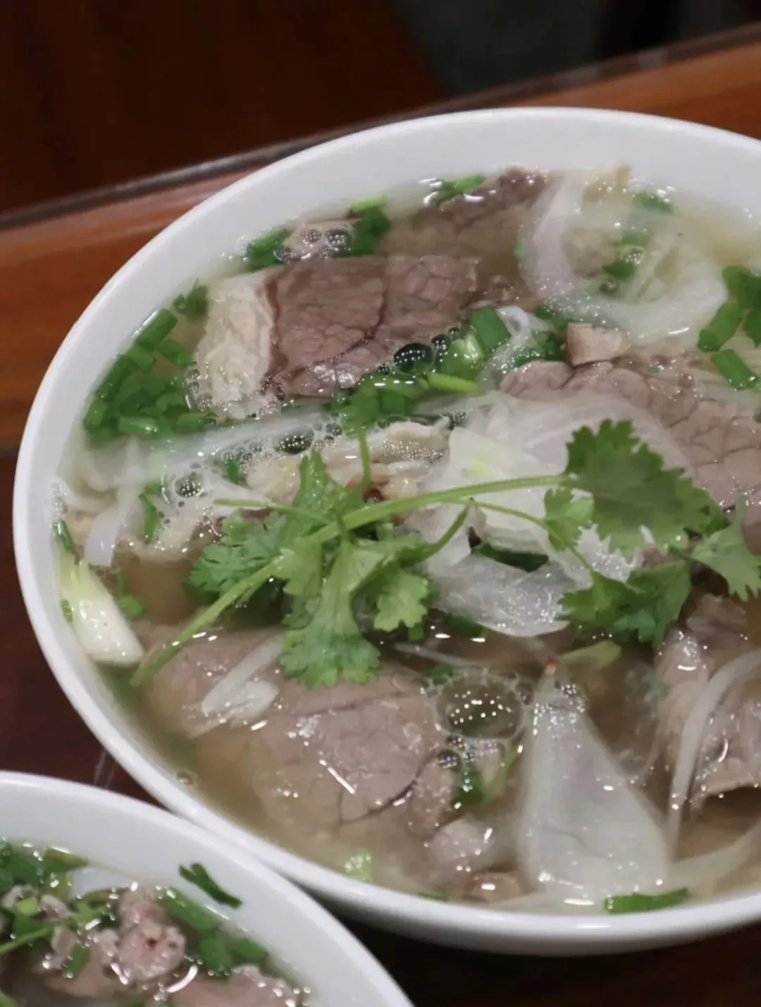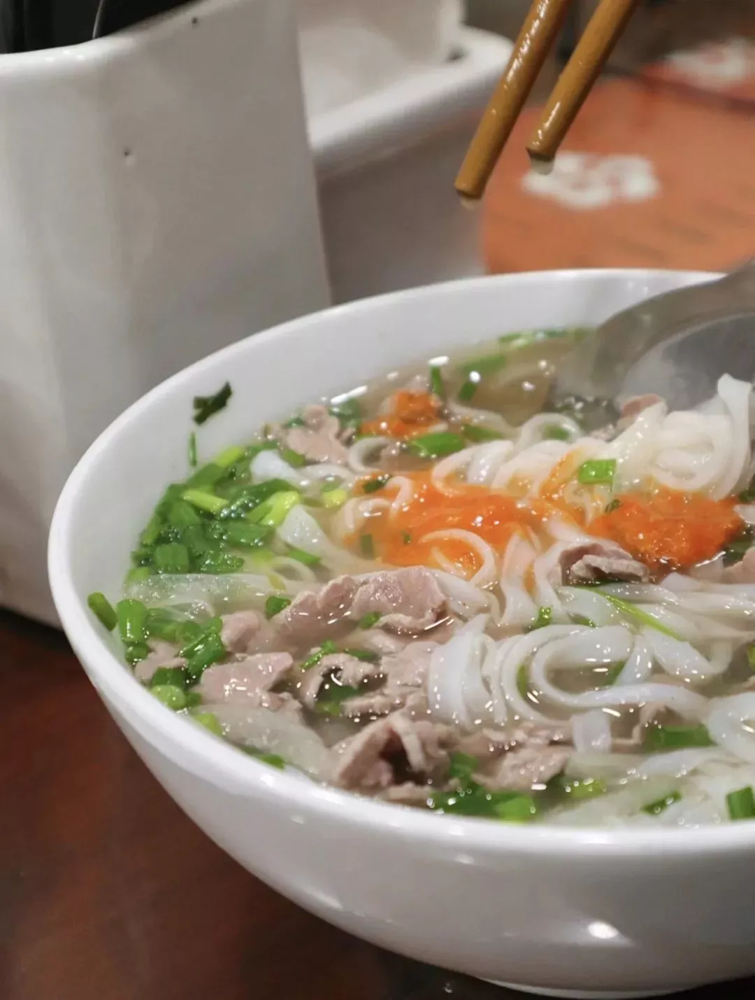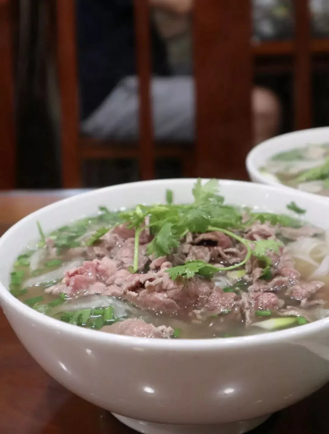 说起越南菜,最经典、最受欢迎的还是越南河粉。越南河粉,米粉爽滑、汤汁清澈鲜美。配菜新鲜丰富,有薄荷、香菜等配料,十分过瘾。这是最具代表的越南菜之一,汤真的好喝!