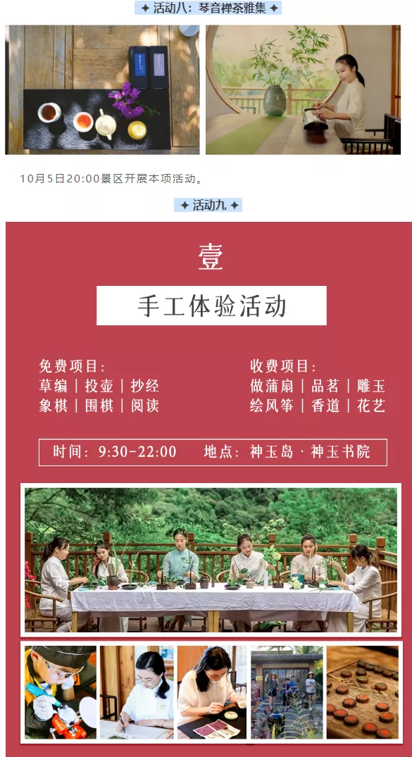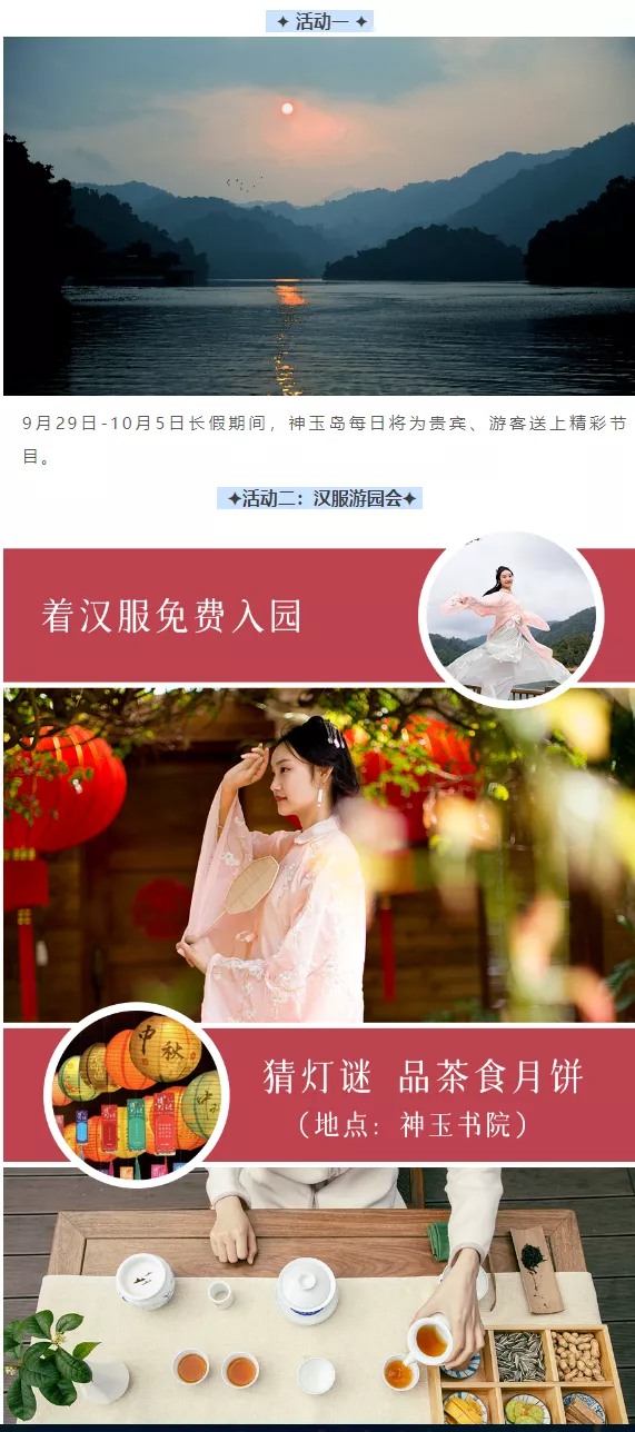 9月29日,神玉岛景区内有猜灯谜、花灯手作等活动,当天身穿汉服可享免费入园福利。