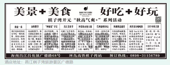 秋游棋子湾,欢乐西海岸,今年中秋、国庆小长假,昌江为你备好了精彩纷呈的文旅活动,旅居山海黎乡,畅玩纯美昌江,昌江旅文为你整理了酒店、景区优惠信息,让你的昌江之旅更加划算方便,还等什么,酒店优惠囤起来~