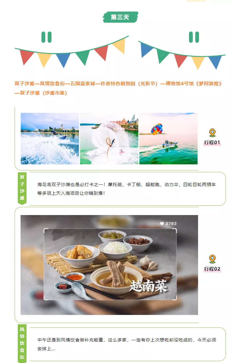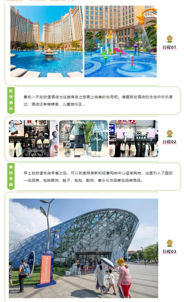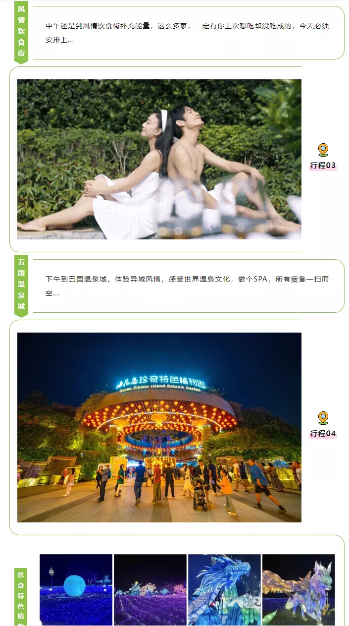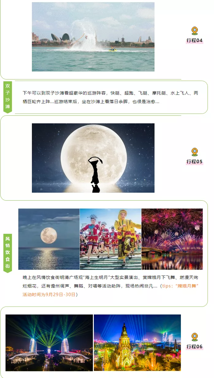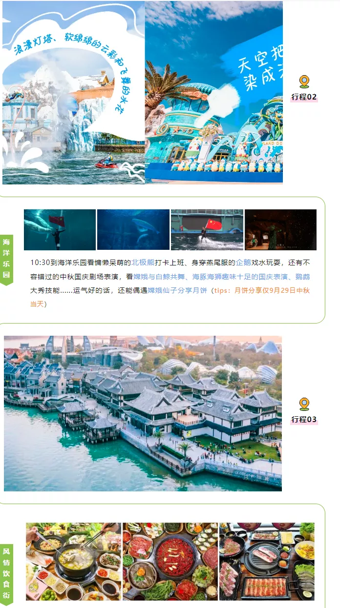 第一天:欧堡酒店—海洋乐园—风情饮食街—双子沙滩—风情饮食街(海上生明月)—婚礼庄园(灯光秀)