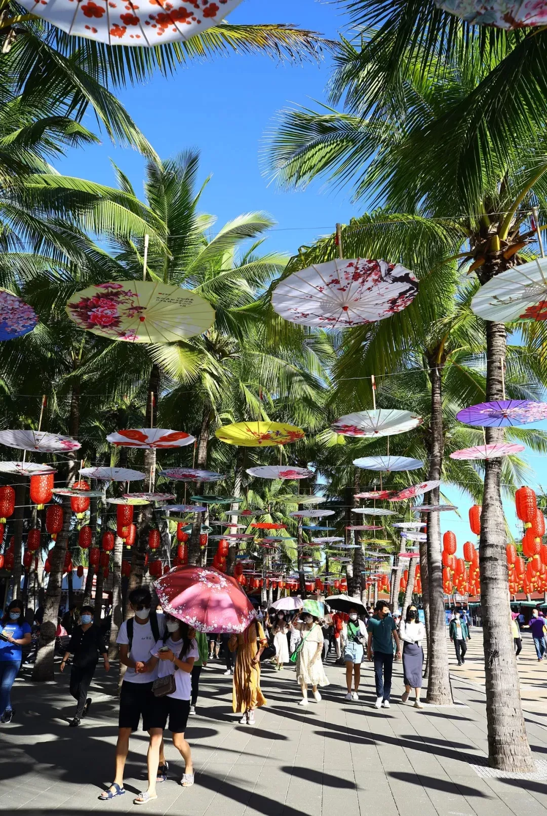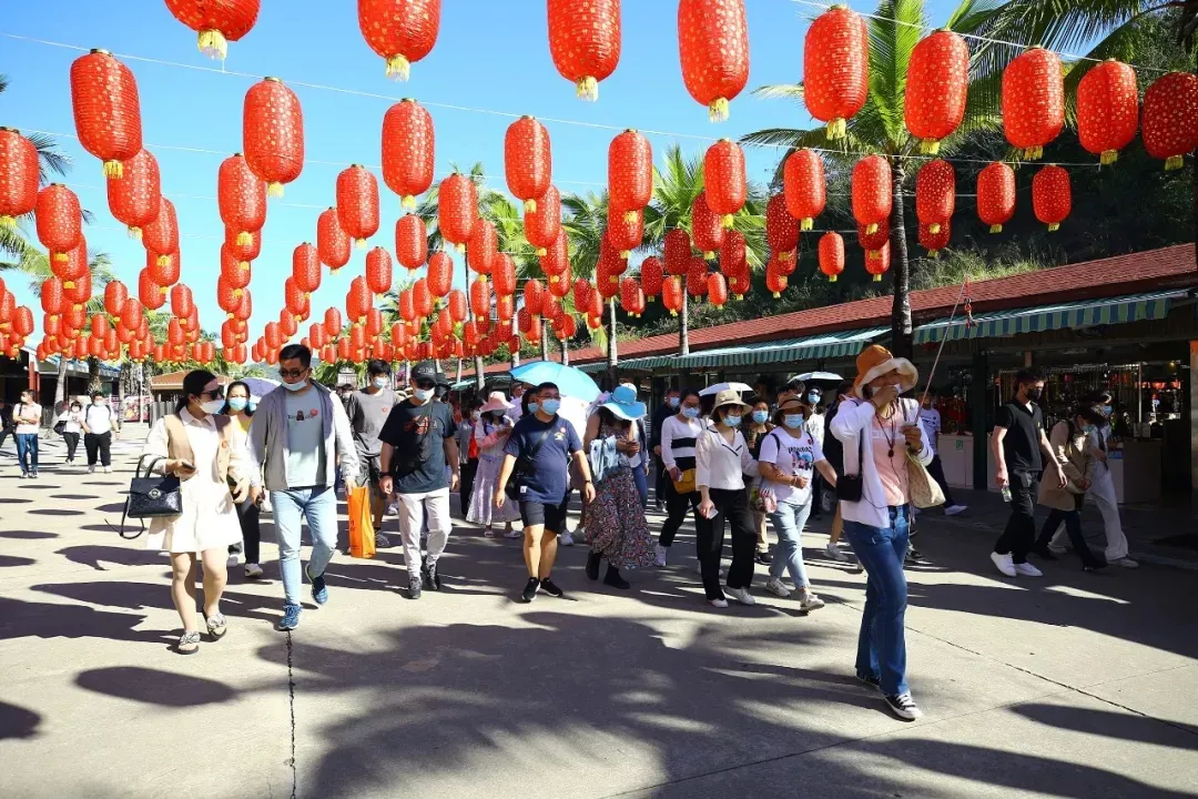 近日,南山文化旅游区大红灯笼高挂,喜庆祥和,游人纷至,乐享没有冬天的迷人热带风光,感受独特的人文魅力。2021年12月31日,景区开门营业将延长到当晚的十点半,方便人们到南山寺祈福迎新年