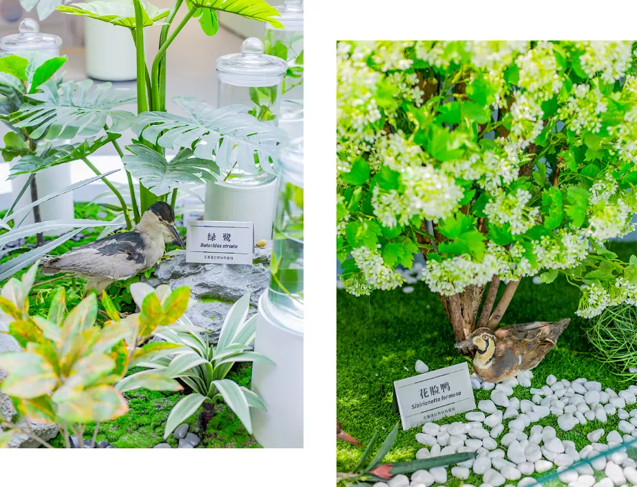 东寨港保护区也被称作物种基因和资源的宝库,来到二楼,在丛林揽胜、鱼虾粮仓、万鸟啁啾展区,这片“海上森林”的多姿多彩得到全方位展示,数十种珍稀鸟类写真铺展开来,一个个动植物活体标本栩栩如生,从平面到立体,360度呈现红树林的生物多样性魅力。