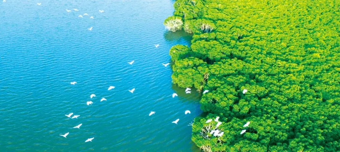 在东寨港岸边远眺,极目所见,青绿成片,红树林与蓝天碧水交相辉映,这就是我国第一批以红树林为主的湿地类型自然保护区——东寨港国家级自然保护区。