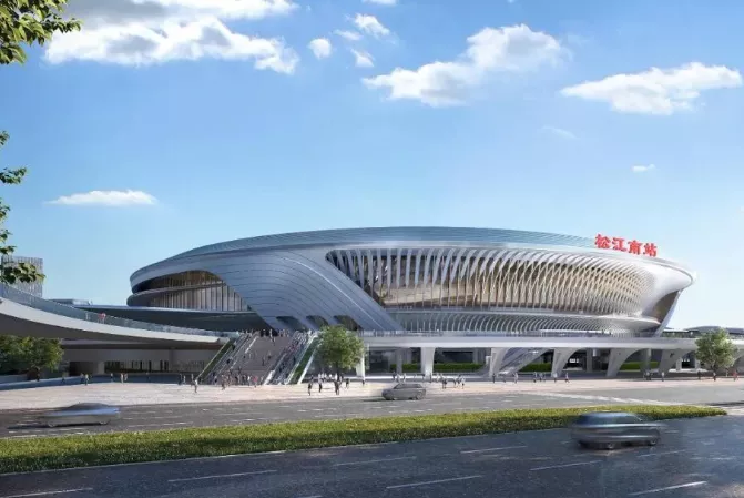 原松江南站站房和南侧松江南站站房的工程初步设计较之前也有了一些变更,改为桥式站,车站采用站城综合体模式设计,站房采用高架候车厅+线侧式站型。