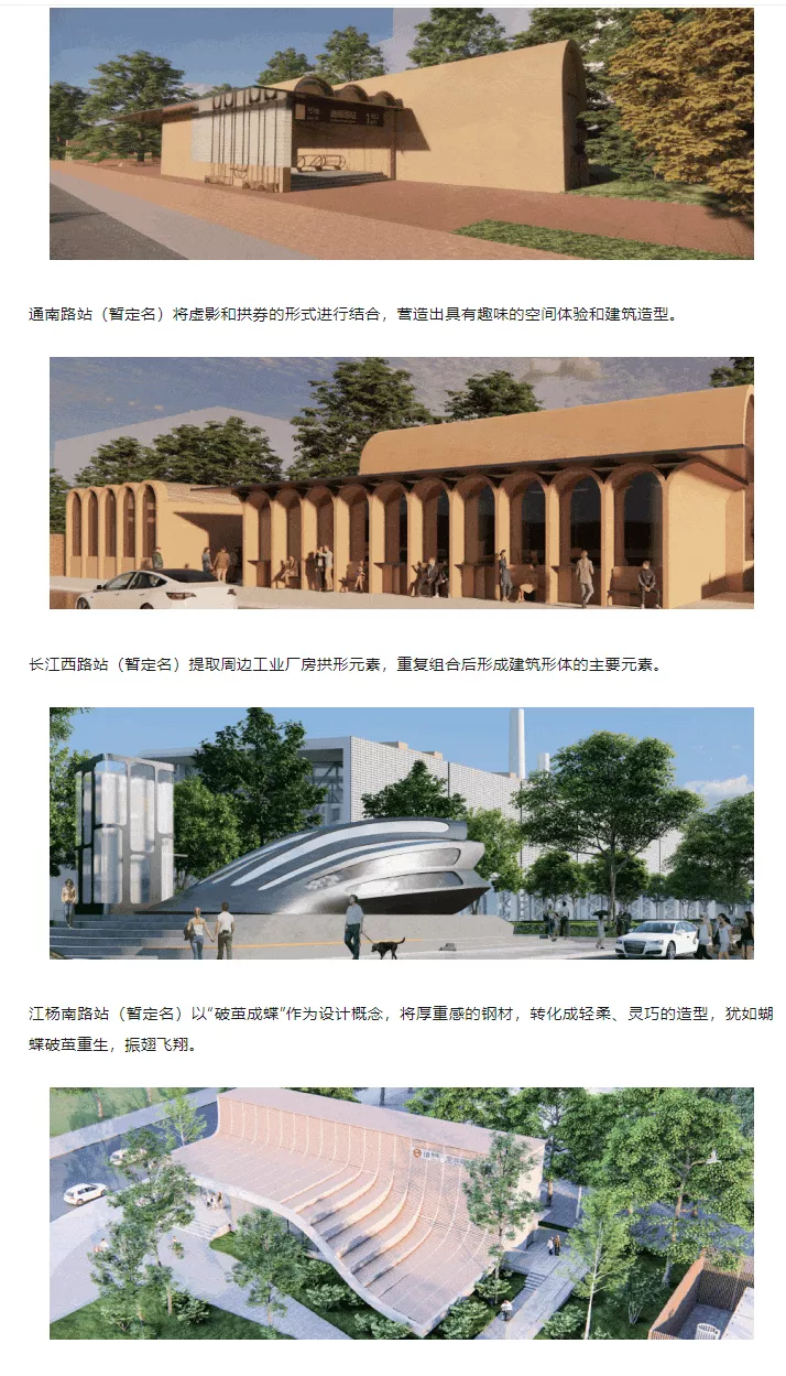 大康路站(暂定名)打造飞鸟般具有张力及结构美学的拱形屋面。哑光金属屋面及参数化砖砌防汛墙呼应18号线钢铁文化的特色。
